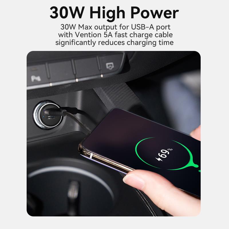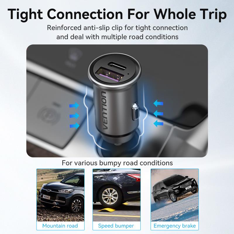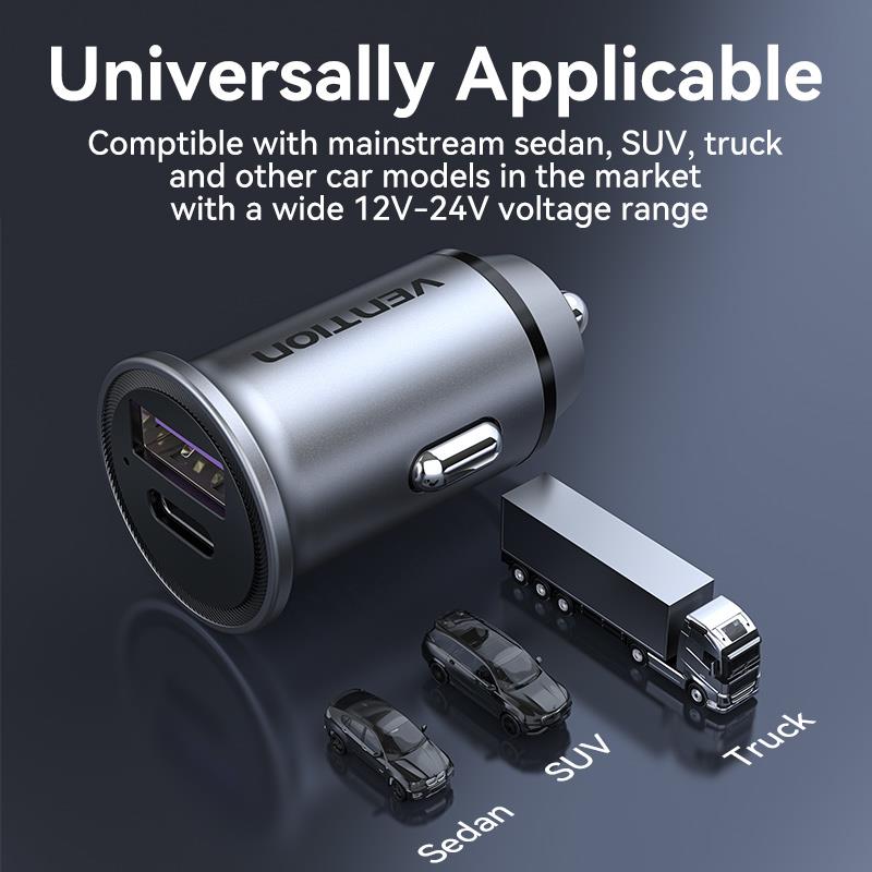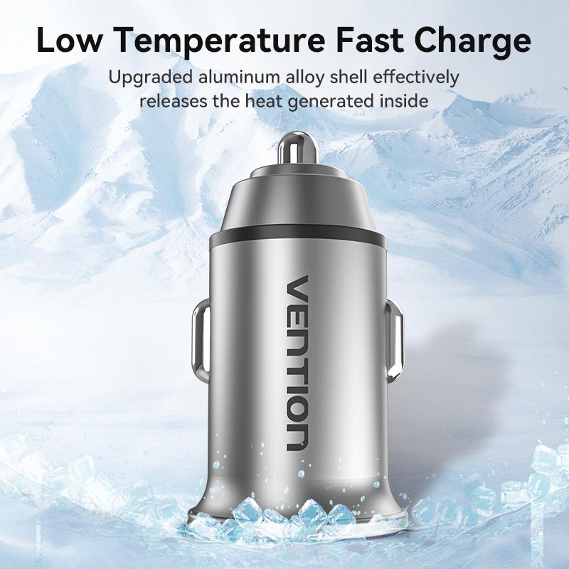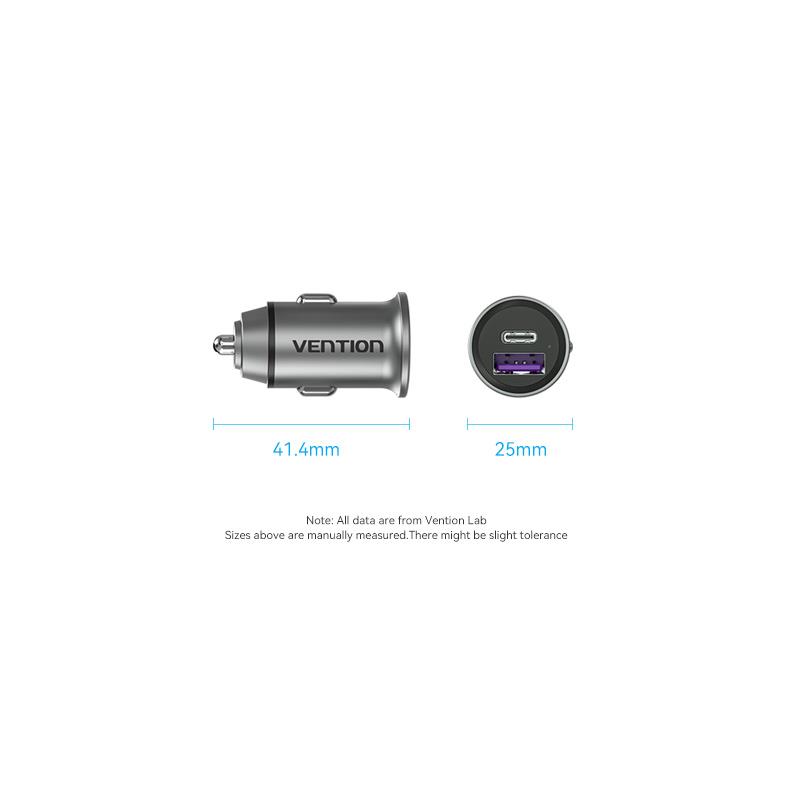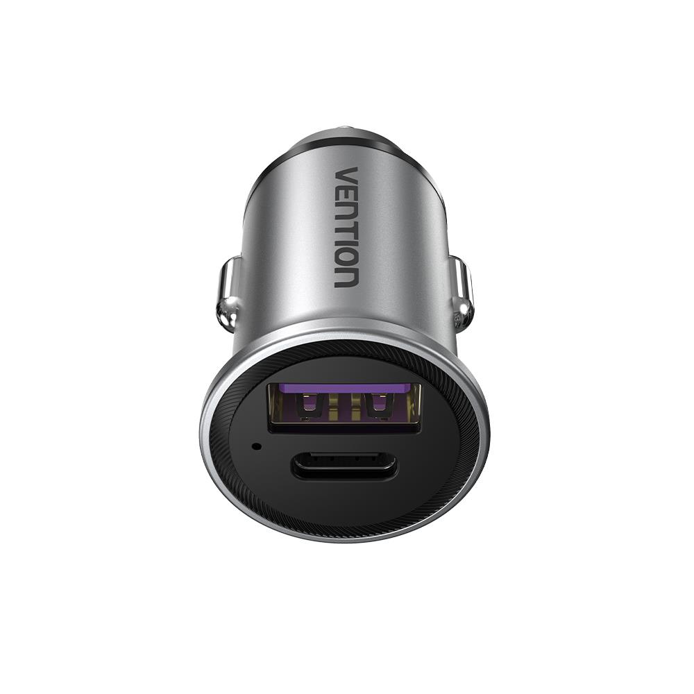 Summary: Vention Two-Port USB A+A(30+30) Car Charger Gray Mini Style Aluminium Alloy Type. Charger type: Auto, Power source type: Cigar lighter, Charger compatibility: Universal, USB Type-C ports quantity: 1, Fast charging. Product colour: Grey