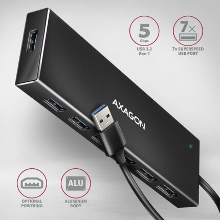 Description: AXAGON HUE-F7A  The slim USB 3.2 Gen 1 (USB 3.0) hub AXAGON HUE-F7A with a 1 m long USB cable